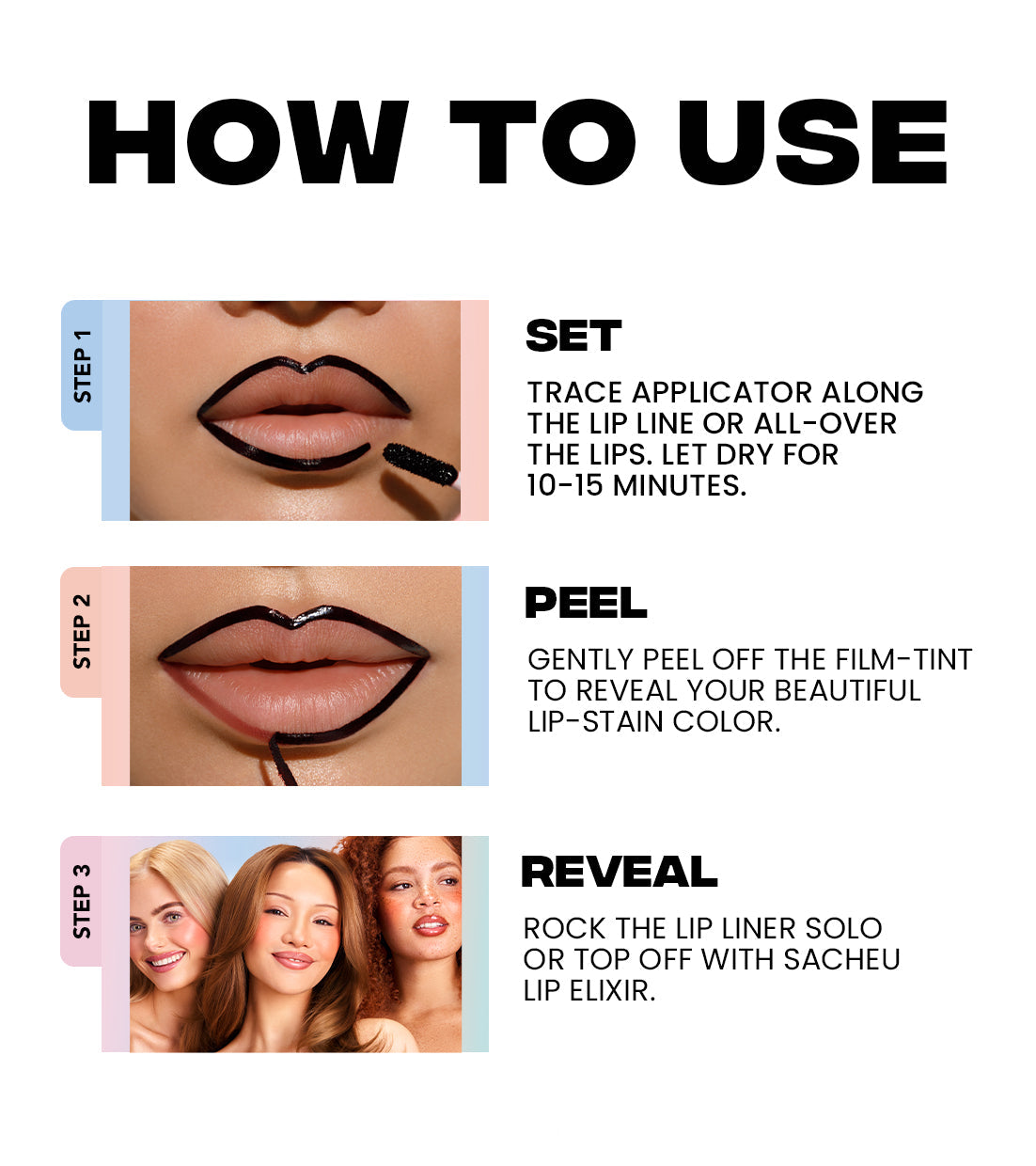 Debug product metafields: {"how_to_use":"\u003cdiv class=step\u003e\u003cdiv\u003e\u003cimg alt=\"\"src=\"https:\/\/cdn.shopify.com\/s\/files\/1\/0257\/7583\/3137\/files\/Lip_Liner-Step-1.jpg?v=1723433133\"\u003e\u003c\/div\u003e\u003cdiv\u003e\u003cb\u003eStep 1 - SET:\u003c\/b\u003e Trace applicator along the lip line or all-over the lips. Let dry for 10-20 minutes.\u003c\/div\u003e\u003c\/div\u003e\u003cdiv class=step\u003e\u003cdiv\u003e\u003cimg alt=\"\"src=\"https:\/\/cdn.shopify.com\/s\/files\/1\/0257\/7583\/3137\/files\/Lip_Liner-Step-2.jpg?v=1723433133\"\u003e\u003c\/div\u003e\u003cdiv\u003e\u003cb\u003eStep 2 - PEEL:\u003c\/b\u003e Gently peel off the film-tint to reveal your beautiful lip-stain color.\u003c\/div\u003e\u003c\/div\u003e\u003cdiv class=step\u003e\u003cdiv\u003e\u003cimg alt=\"\"src=\"https:\/\/cdn.shopify.com\/s\/files\/1\/0257\/7583\/3137\/files\/Lip_Liner-Step-3.jpg?v=1723433133\"\u003e\u003c\/div\u003e\u003cdiv\u003e\u003cb\u003eStep 3 - REVEAL:\u003c\/b\u003e Rock the lip liner solo or top it off with your favorite lip gloss\/oil, like \u003ca href=https:\/\/sacheu.com\/products\/sweet-balm\u003eSACHEU Beauty's Sweet Balm\u003c\/a\u003e.\u003cbr\u003e\u003cbr\u003e\u003cb\u003ePro tip:\u003c\/b\u003e Ensure lips are clean \u0026 dry and no other lip-balm or lip-gloss is applied prior. Residue product could result in the lip liner not staining properly.\u003c\/div\u003e\u003c\/div\u003e","how_to_use_video":"gid:\/\/shopify\/Video\/43336880947518"}