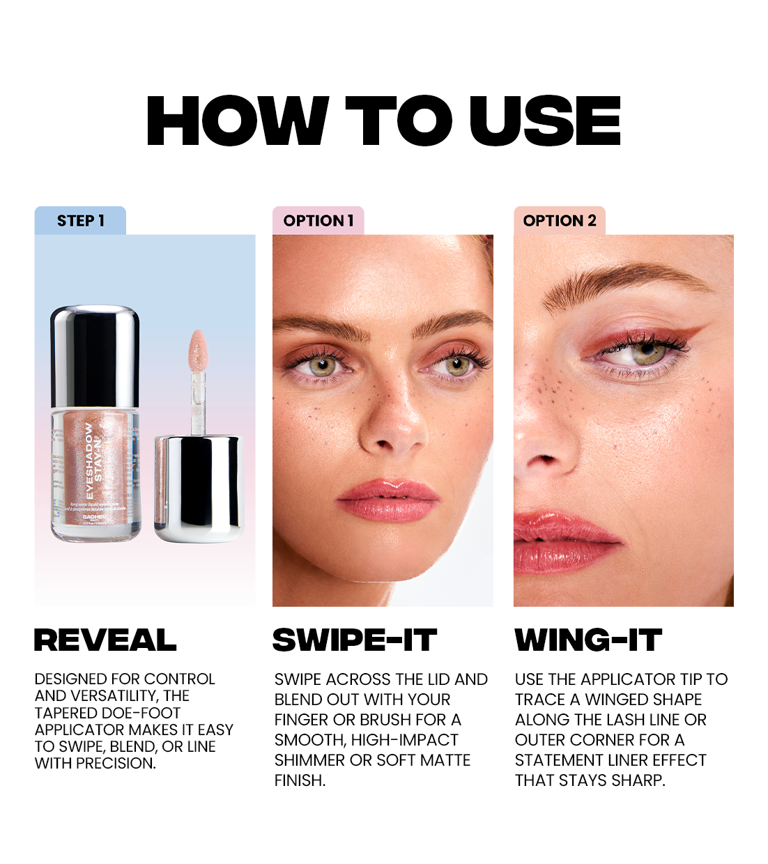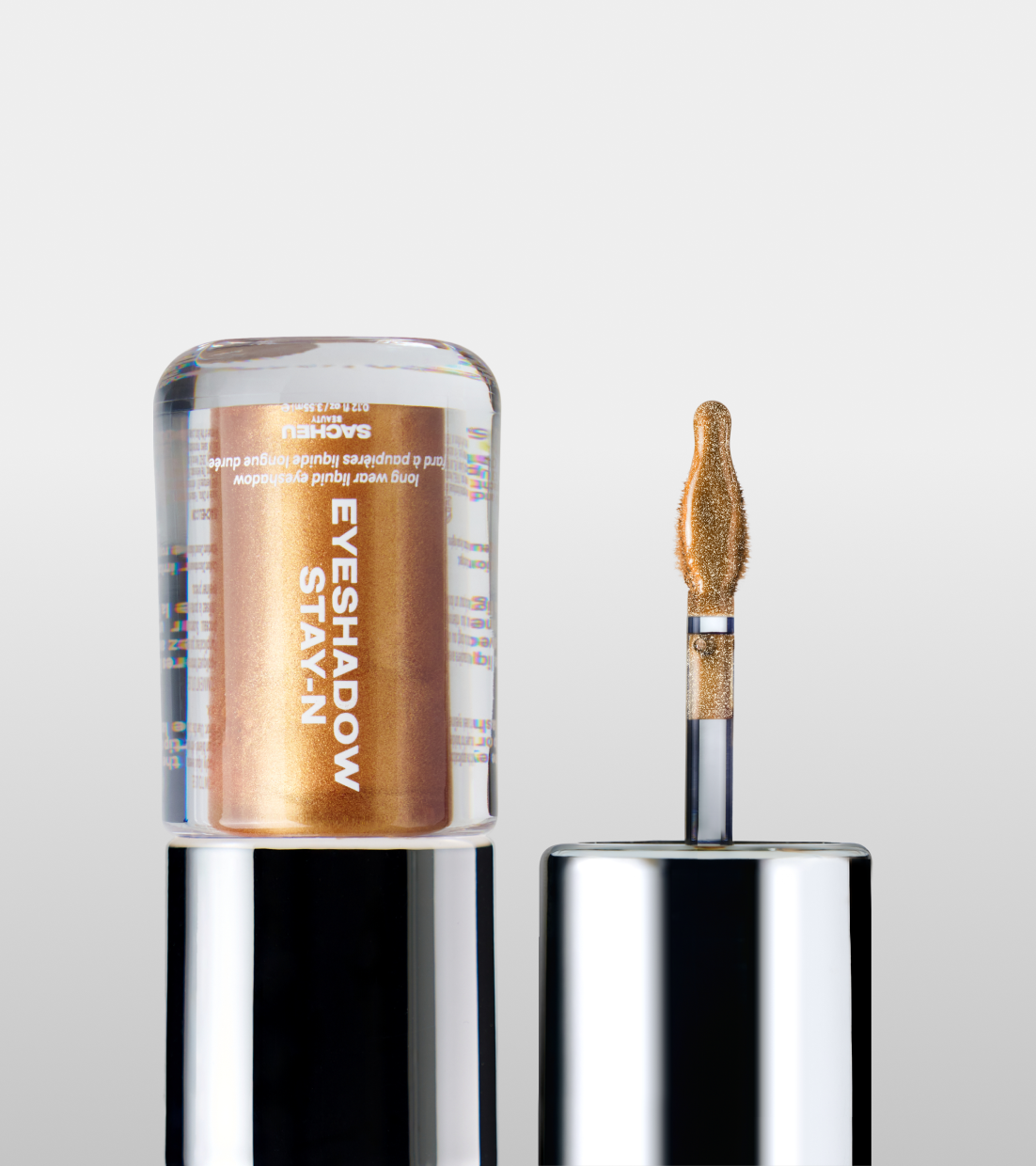 Apply: Apply a thin layer of liquid eyeshadow to the eyelid with the applicator, to achieve a bolder hue add another layer and blend with your fingertip or a brush.
