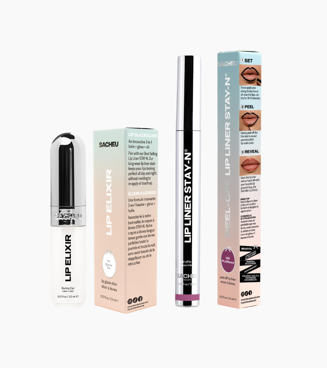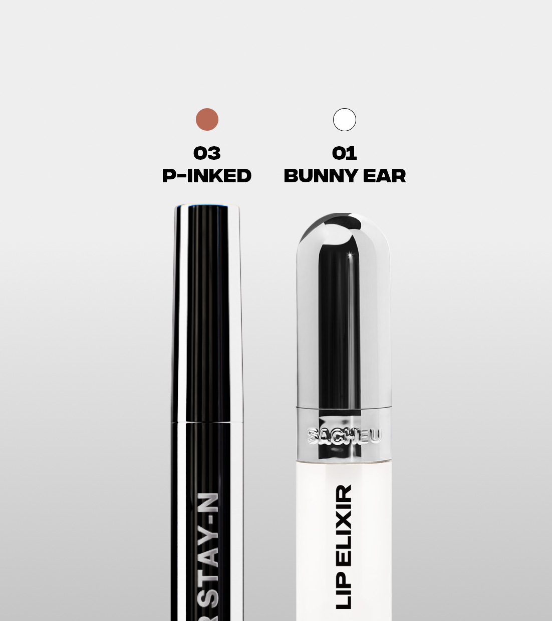 Elevate your lip game with the Line & Shine Bundle, featuring the Lip Liner STAY-N 03. p-INKED and the Lip Elixir 01. Bunny Ear - Clear.